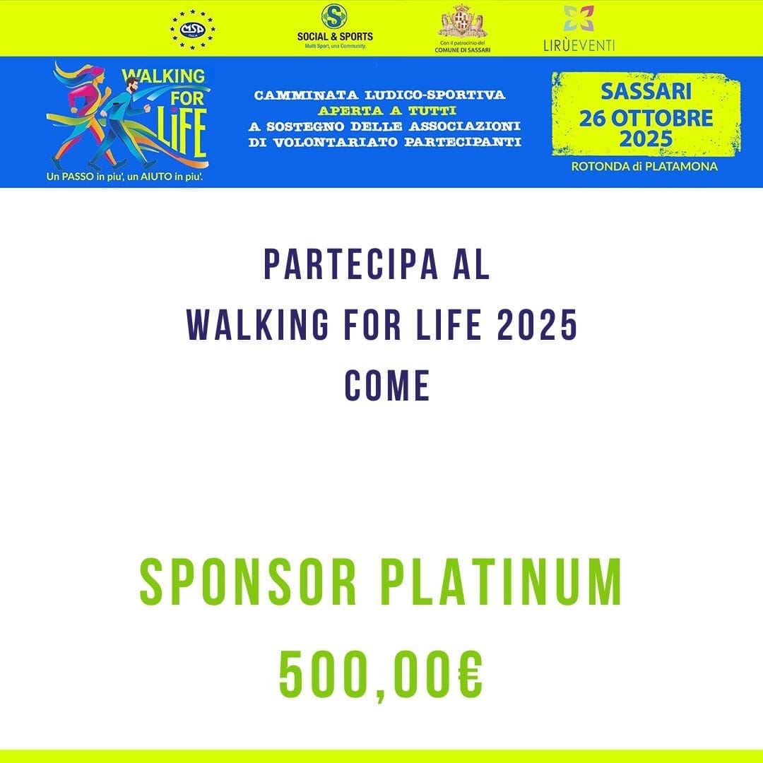 Ricordiamo l'importanza di essere Sponsor PLATINUM. Oltre i benefit descritti, la metà del contributo è destinato all'associazione che vi ha segnalato o che avete scelto o che comunicherete alla segreteria organizzativa dopo l'acquisto.